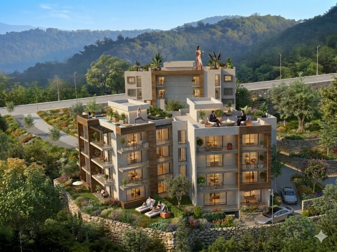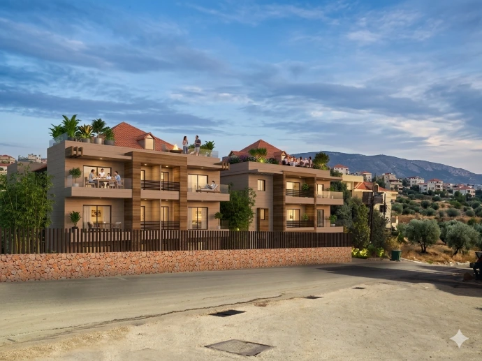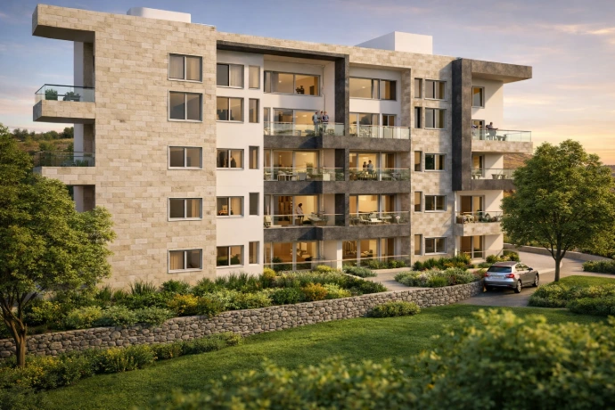 Elegant apartment residence featuring natural stone finishes, wide glass façades, and generous terraces designed for comfortable modern living.
